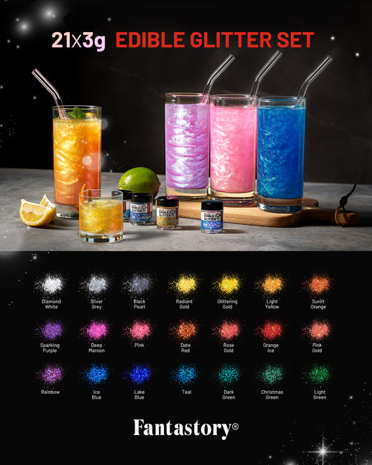 Fantastory Edible Glitter for Cocktails, Drinks, 21 Colors(3g) Luster Dust Edible for Beverage, Wine,Desserts,Jello,Chocolates,Cookie Decorations -Odorless,Vegan,Sugar&Gluten Free,Unleaded