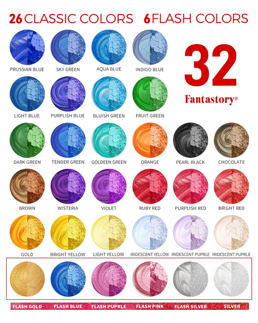 Fantastory Mica Powder for Epoxy Resin, 32 Colors(0.35oz/10g) Cosmetic Grade Pigment Powder, Incl. 6 Jars Glitter Mica Powders for Candle Making, Car Freshies, Soap, Bath Bomb, Crafts, Slime