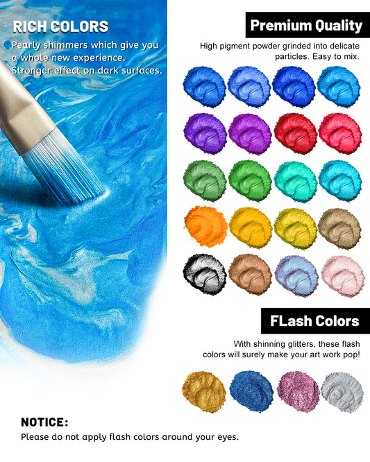 Fantastory Mica Powder for Epoxy Resin, 24 Colors Cosmetic Grade Resin Pigment Powder(0.35oz/10g), Incl. 5 Jars Glitter Mica Powders for Candle Making, Car Freshies, Soap, Bath Bomb, Crafts, Slime