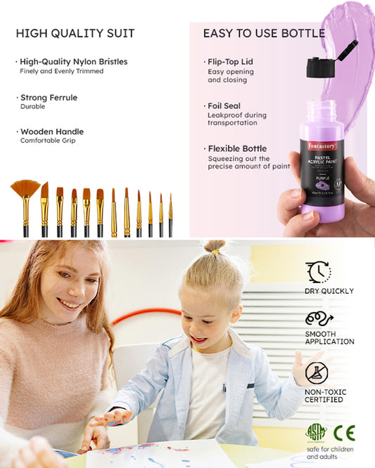 Fantastory Pastel Acrylic Paint Set+12 Brushes, 24 x 2oz Pastel Colors Art Craft Paint for Artists, Halloween Decorations, Canvas Ceramic Wood Rock Painting Supplies Kit