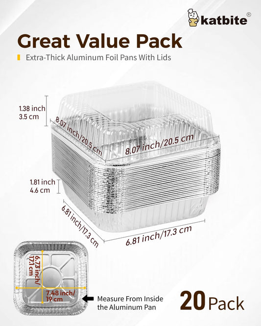 Katbite 8x8 inch (20 Packs) Disposable Aluminum Foil Pans With With Clear Lids Foil Baking Pans Square Aluminum Baking Pans