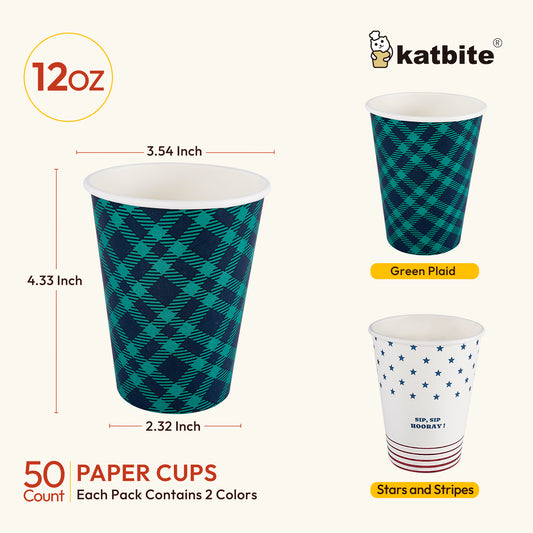 Katbite 50 Pcs 12 oz Disposable Paper Cups for Hot/Cold Beverages, Plaid and Star Design