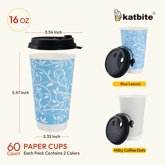 Katbite Disposable Cups Paper Cups with Lids Biodegradable and Eco-Friendly 16 oz 60 Count